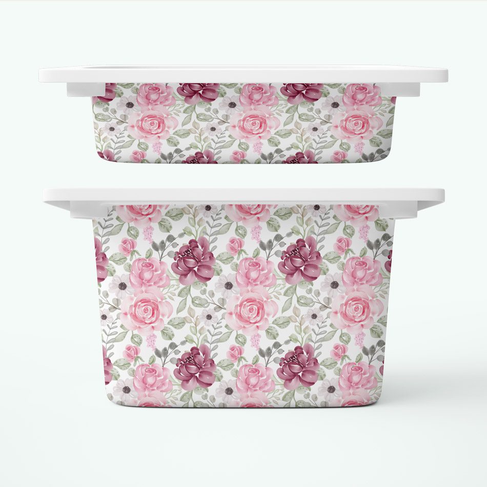 – trzy naklejki na średnie pojemniki z różowymi kwiatami.